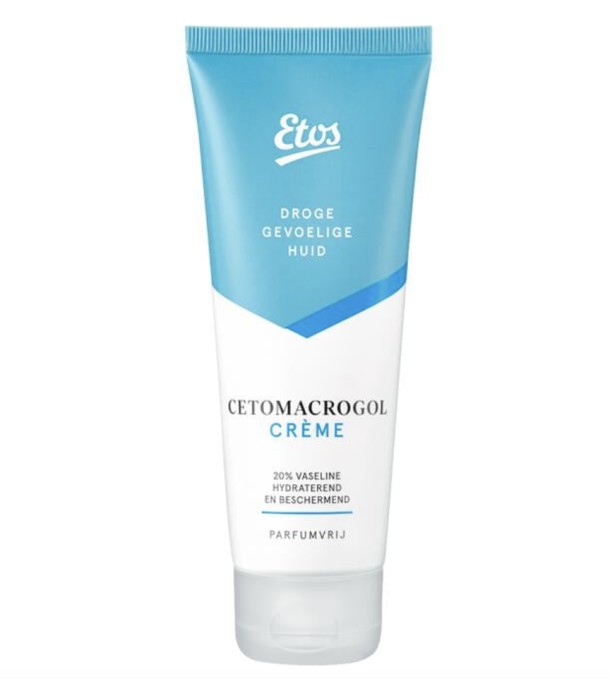 Etos Cetomacrogol Crème verzorgt en beschermt de droge en gevoelige huid. De crème bevat 20% vaseline en geen parfum.