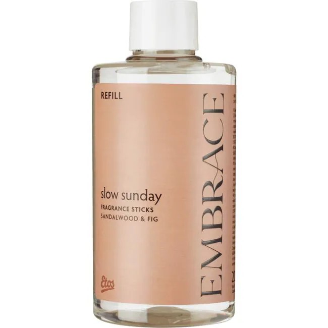 Etos Embrace Fragrance Sticks Slow Sunday refill is de navulling voor de aromatische geurstokjes gemaakt met essentiële oliën. De geurstokjes gaan mee tot 12 weken en verspreiden langdurig een subtiele geur.