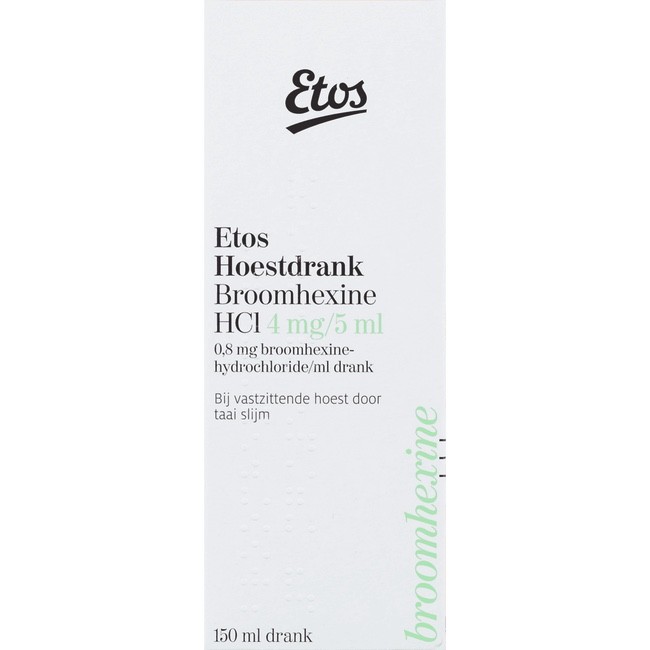 Etos Hoestdrank Broomhexine HCl 4 mg/5 ml, bij vastzittende hoest, om het ophoesten van slijm in de luchtwegen te vergemakkelijken als dit door de taaiheid van het slijm wordt bemoeilijkt.