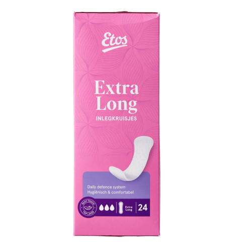 Etos Inlegkruisjes Extra Long geven je dagelijks bescherming tegen vaginale afscheiding en bieden extra bescherming tijdens je menstruatie. Ze zijn gemaakt van huidvriendelijk en ademend materiaal, wat zorgt voor een schoon en fris gevoel. Etos Inlegkruisjes Extra Long met Daily Defence System zijn hygiënisch en comfortabel en zijn langer, voor extra bescherming.