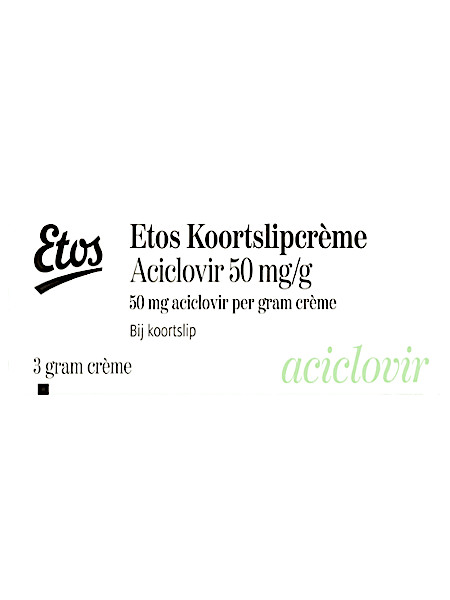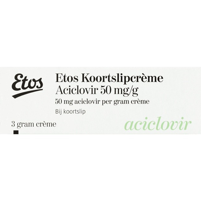 Etos Koortslipcrème Aciclovir 50 mg/g wordt gebruikt voor de behandeling van een koortslip, veroorzaakt door een herpesvirus. Deze koortslipcrème bevat aciclovir, een middel tegen herpesvirussen en gaat de vermenigvuldiging van herpesvirussen in de huid tegen.