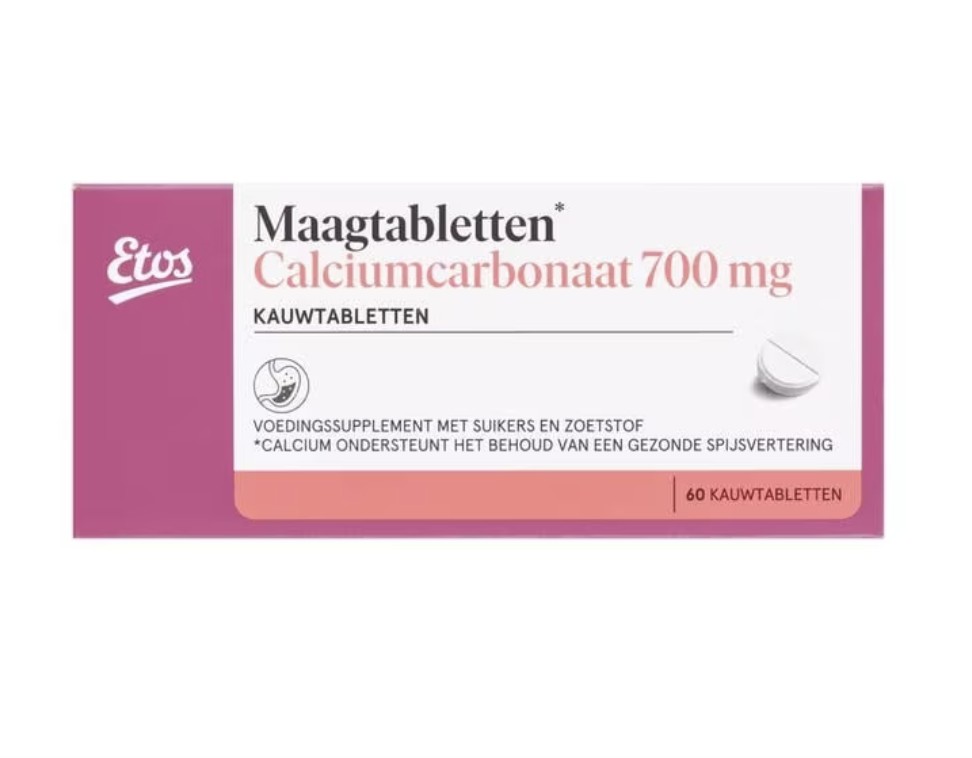 Etos Maagtabletten Calciumcarbonaat 700 mg 60 stuks bevat suiker en zoetstof. Elk tablet bevat 700 mg calciumcarbonaat, overeenkomend met 280 mg calcium. Calcium ondersteunt het behoud van een gezonde spijsvertering.