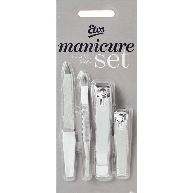 Met een grote en kleine nagelknipper, een pincet en een vijl.