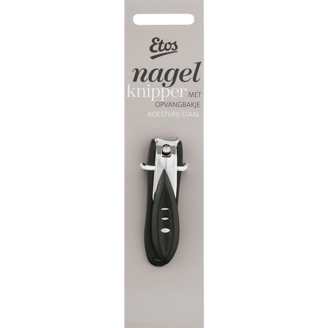 De Etos Nagelriemschaar Met Opvangbak is een handige knipper met opvangbakje van roestvrij staal.