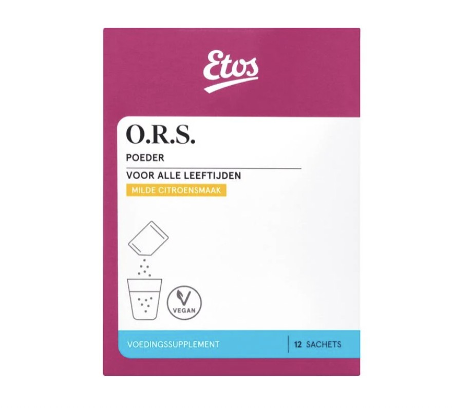 Etos O.R.S. Elektrolytpoeder Sachets is een glucose-zouten preparaat om vochtverlies te compenseren. Door druk op het lichaam, zoals braken, overvloedig zweten of extreme fysieke en sportieve belastingen kan men mineralen verliezen die moeten worden vervangen. Met de Etos O.R.S. met elektrolytenpoeder kan uitdroging worden opgevangen en is geschikt voor gebruik door zuigelingen, kinderen en volwassenen.