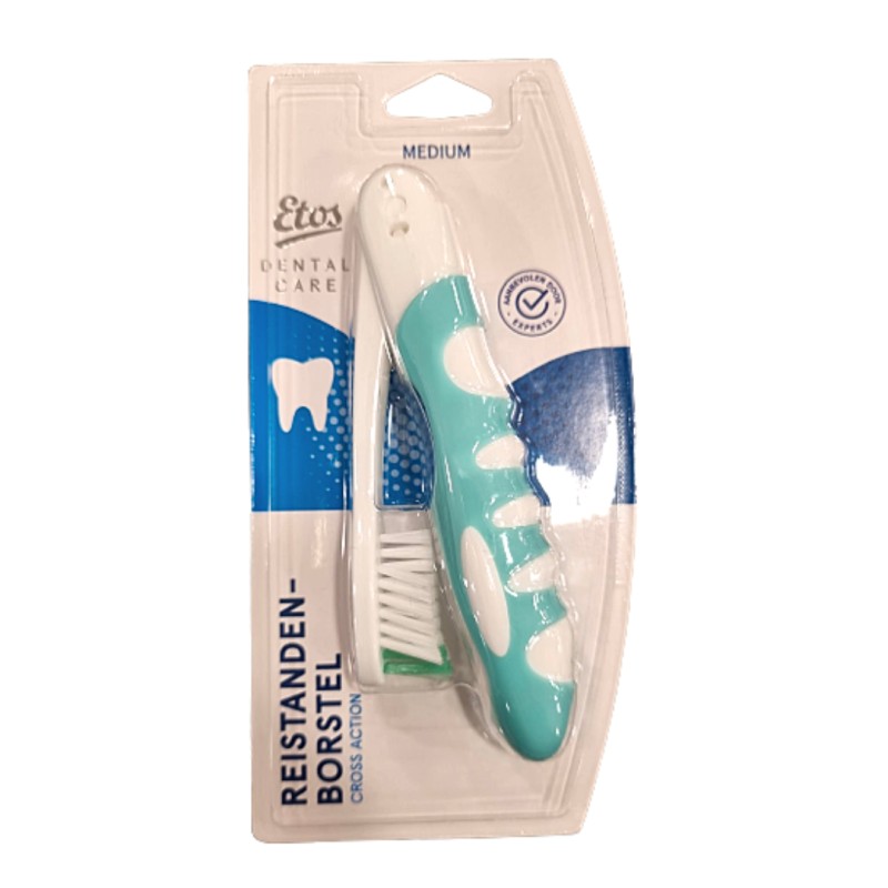 Etos Reistandenborstel Mini met cross action borstelharen zorgt ook tijdens je reis en vakantie voor een goede reiniging van de tanden kiesoppervlakken. Door de kruislings geplaatste haren wordt ook hardnekkig tandplak goed verwijderd. Met een comfortabele antislip-grip voor extra poetsgemak. De tandenborstel neemt ingeklapt weinig ruimte in beslag.