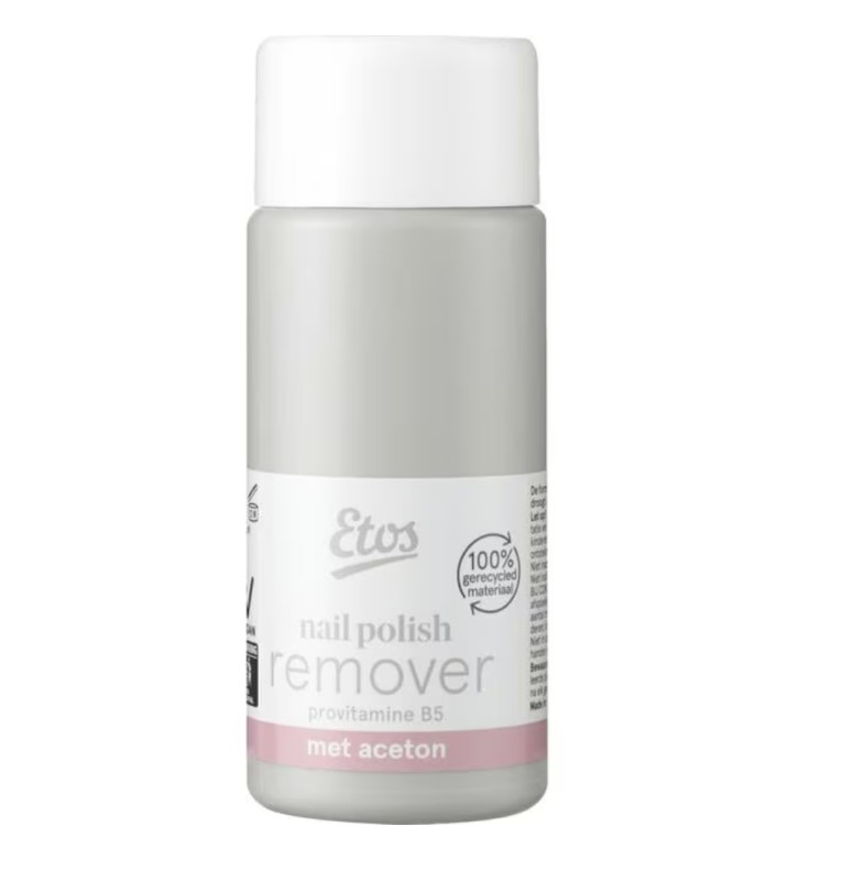 Etos Nail polish remover met aceton 150 ml verwijdert moeiteloos nagellak. De nail polish remover verwijdert snel en efficiënt alle soorten nagellak. De remover bevat provitamine B5 en droogt de nagels niet uit.