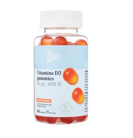 Etos Vitamine D3 gummies met sinaasappelsmaak. Vitamine D draagt bij aan een sterk gebit en zorgt mede voor een goede weerstand. Daarnaast speelt vitamine D een rol bij het behouden van sterke spieren.