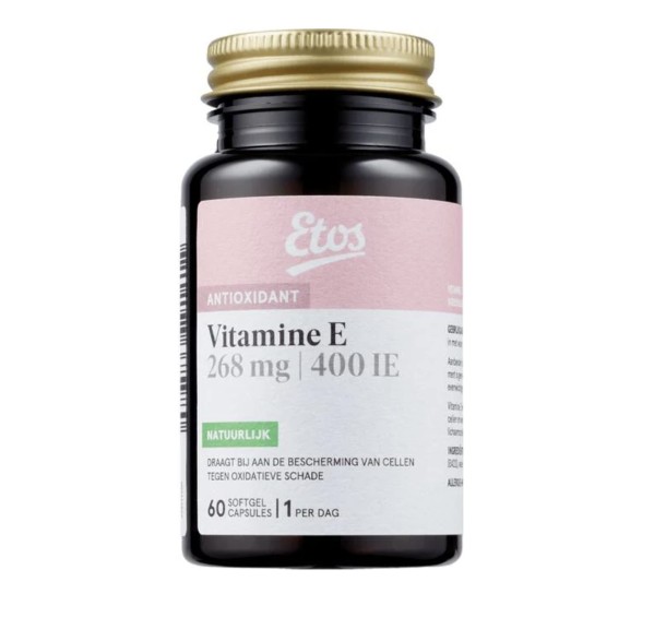 Etos Vitamine E 268 mg | 400IU capsules bevatten een hoge dosering vitamine E. Vitamine E levert een bijdrage aan de bescherming van gezonde cellen en weefsels en helpt het natuurlijk afweersysteem van de lichaamscellen.