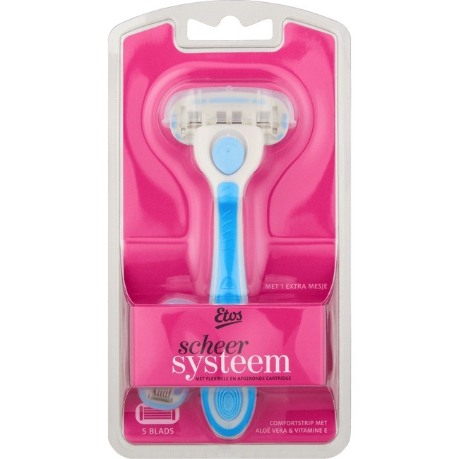 Etos Vrouw Scheersysteem 5-Blads met flexibele scheerkop volgt de contouren van je lichaam nauwkeurig. De comfortstrip met Aloë Vera en Vitamine E zorgt voor een dun glijlaagje op je huid waardoor je makkelijker en gladder kunt scheren. De lichte ergonomische handgreep met stroeve grip geeft je betere controle, ook in een natte omgeving.