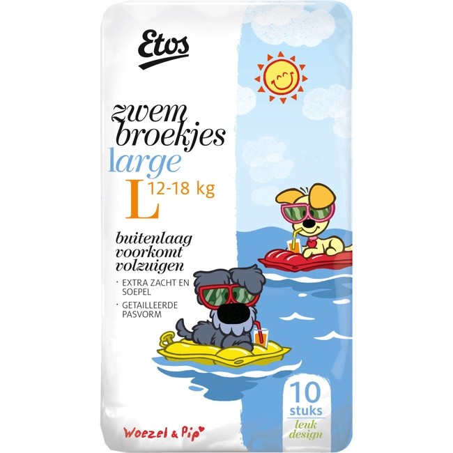 Zachte en soepele Etos Zwembroekjes Medium met een speciale buitenlaag die voorkomt dat de luier volzuigt met water. De zwembroekjes houden ontlasting tegen. De broekjes hebben een goede pasvorm en zijn makkelijk aan en uit te trekken.