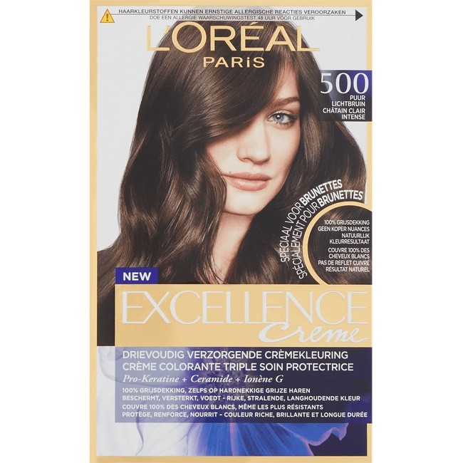 L’Oréal Paris Excellence EXCELL FR/NL 500 True Light Brown Haarkleuring Bruin is een rijke, levendige en permanente kleuring (natuurlijke en heldere bruine kleur) met 100% grijsdekking. Met Drievoudig Verzorgende crèmekleuring: een geavanceerde, beschermende haarkleuringstechnologie die drie krachtige ingrediënten bevat. 1. De Excellence kleurcrème, verrijkt met Pro-Kératine , revitaliseert en versterkt het haar. 2. Het beschermend serum, verrijkt met Ceramide, een replica van het natuurlijke cement van het haar, beschermt en maakt het haar glad. 3. Excellence verzorging met Collageen herstelt het haar en maakt het sterker. Staat bekend om zijn versterkende kracht