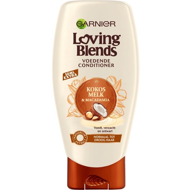Garnier Loving Blends - Kokosmelk & Macadamia - Haarconditioner: Speciaal om normaal tot droog haar te voeden en verzachten heeft Garnier Loving Blends een nieuw recept ontwikkeld met: - Kokosmelk om haar voedende eigenschappen voor het haar. - Macadamianoot olie om het haar te verzachten en versoepelen Het resultaat Het haar is intens gevoed, verzacht en straalt van schoonheid. Het haar voelt zachter en soepeler aan en heeft een schitterende glans.