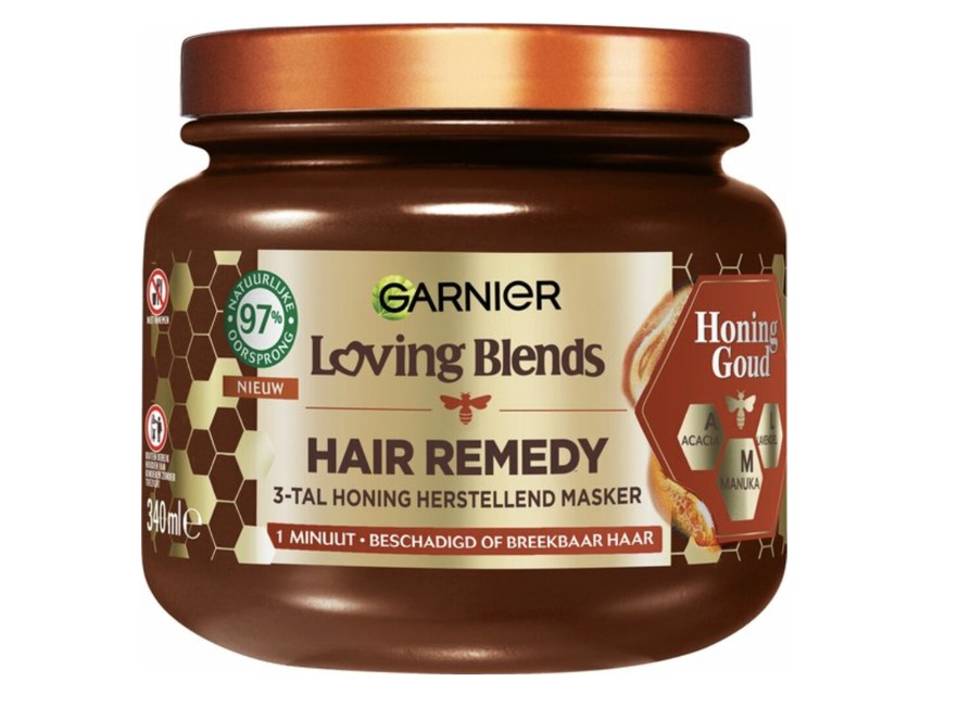 Het Loving Blends Honing Goud haarmasker van Garnier is onze ultieme masker voor beschadigd haar. Ontdek de kracht van een bijenkorf: onze 3-tal honingen acacia, manuka en lavendel, bekend om hun herstellende, versterkende & voedende eigenschappen voor het haar, zijn samengevoegd in onze herstellende remedie. Het herstelt de 3 belangrijke tekenen van haarschade intensief: gespleten punten, haarbreuk, en haarscheuren in enkel 1 minuut:- 2x minder gespleten punten*- 10x minder haarbreuk*Hoe te gebruiken: Breng aan op nat haar, laat het één minuut inwerken en spoel uit.Garnier zet zich in voor green beauty. Formule zonder siliconen, voor een natuurlijk gevoel. Pot gemaakt van 100% gerecycled plastic**. Duurzaam geproduceerde acacia honing. Loving Blends is gecertificeerd door Cruelty Free International. Loving Blends steunt The Bee Conservancy. Ecologische impact Garnier zet zich voortdurend in om de ecologische en sociale impact van haar producten te verminderen tijdens hun gehele levenscyclus, dus inclusief gedurende de productie- en gebruiksfase. Daarnaast streven wij ernaar om jou op een transparante manier toegang te geven tot deze gegevens, zodat jij beter geïnformeerde beslissingen kunt maken over welke producten je aanschaft. Daarom lanceert Garnier het Product Impact Labelling Systeem. Om zo transparant mogelijk te zijn is deze methode ontwikkeld met de hulp van onafhankelijke wetenschappelijke experts en de gegevens zijn gecontroleerd door het onafhankelijke Bureau Veritas. Dit product krijgt een A.*Instrumentele test na gebruik van shampoo en conditioner of na het masker alleen.***Recyclebare pot gemaakt van 100% gerecycled plastic, behalve de dop, kleurstoffen en additieven.