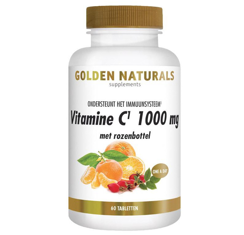 Vitamine C is misschien wel de koning onder de vitaminen, omdat het voor heel veel lichaamsfuncties belangrijk is. Denk aan bloedvaten, botten, kraakbeen, energie, huid en immuunsysteem. Vitamine C draagt ook bij tot de vermindering van vermoeidheid en een normale werking van het zenuwstelsel. Volwassenen hebben gemiddeld 80 mg vitamine C per dag nodig. Dit halen we grotendeels uit gezonde en gevarieerde voeding, maar supplementen kunnen een nuttige aanvulling zijn. Golden Naturals Vitamine C 1000 mg met rozenbottel combineert vitamine C met rozenbottel in één krachtig supplement. Rozenbottels zijn ware vitaminebommetjes: de zaadjes uit deze vlezige vrucht zijn een van de rijkste voedingsbronnen van vitamine C. Ze bevatten bijna dertig keer zo veel vitamine C als een sinaasappel. Dankzij die hoge concentratie vitamine C is de rozenbottel een sterke antioxidant. De toevoeging van rozenbottel aan vitamine C zorgt bovendien voor een verbeterde opname.