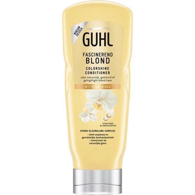 Guhl Colorshine Blond Crème-Conditioner is speciaal ontwikkeld voor natuurlijk, gekleurd of gehighlight blond haar. De blonde kleurpigmenten versterken de stralende accenten van blond haar en maakt het haaroppervlak glad voor veelzijdige lichtreflecties. De conditioner geeft direct hydratatie en zijdezacht haar zonder te verzwaren, voor verbeterde doorkambaarheid. De verfijnde Chardonnay-Bes is rijk aan milde fruitzuren, vitaminen en vochtinbrengende verzorgers, die erom bekend staan de helderheid te intensiveren en zijdezachte verzorging te geven.