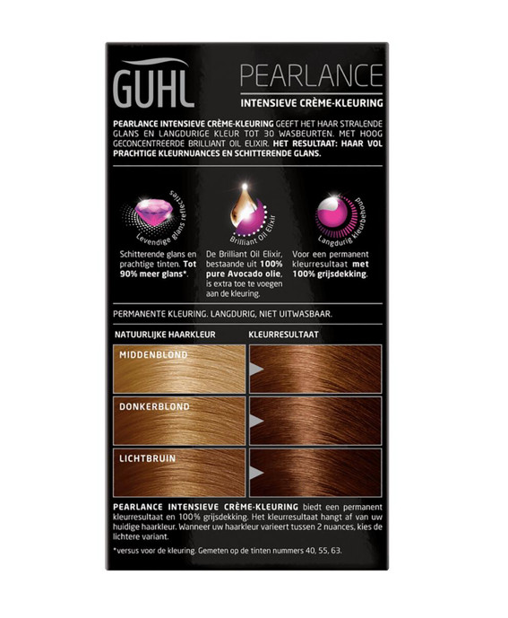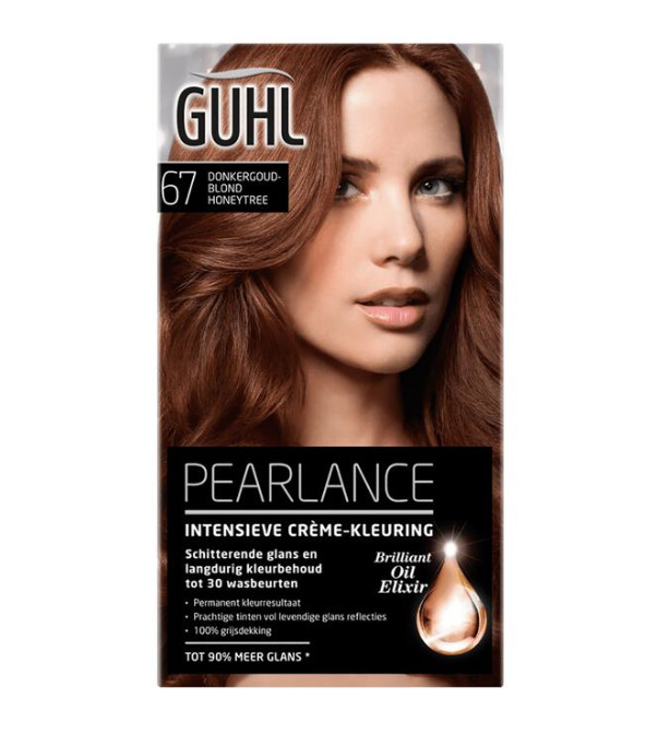 Guhl Pearlance Intensieve Crème-Haarkleuring 67 Donkergoudblond Honeytree, geschikt voor middenblond tot lichtbruin haar, geeft het haar stralende glans en langdurige kleur tot 30 wasbeurten. Met hoog geconcentreerde Brilliant Oil Elixir. Het resultaat: haar vol prachtige kleurnuances en schitterende glans.