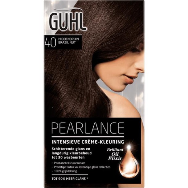 Guhl Pearlance Intensieve Crème-Haarkleuring 40 Middenbruin Brazil Nut, geschikt voor lichtbruin tot donkerbruin haar, geeft het haar stralende glans en langdurige kleur tot 30 wasbeurten. Met hoog geconcentreerde Brilliant Oil Elixir. Het resultaat: haar vol prachtige kleurnuances en schitterende glans.