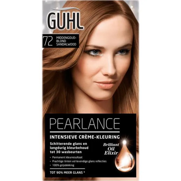 Guhl Pearlance Intensieve Crème-Haarkleuring 72 Middengoudblond Sandalwood, geschikt voor lichtblond tot donkerblond haar, geeft het haar stralende glans en langdurige kleur tot 30 wasbeurten. Met hoog geconcentreerde Brilliant Oil Elixir. Het resultaat: haar vol prachtige kleurnuances en schitterende glans.
