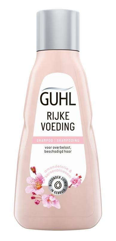 Guhl Rijke Voeding mini shampoo, voor overbelast, breekbaar en beschadigd haar, regenereert de haarvezels tot in de kern en versterkt het haar doelgericht vanaf de aanzet tot in de punten. De voedende shampoo beschermt het haar tegen invloeden van buitenaf en geeft het nieuwe veerkracht en zijdezachte souplesse zonder te verzwaren.