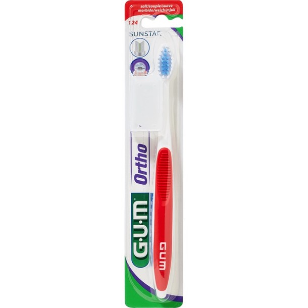 De Gum Ortho Tandenborstel is ontworpen om gemakkelijk op en rondom orthodontische apparatuur te reinigen, dankzij de smalle kop met zachte haartjes die in een v-vorm zijn geplaatst en over het draad en slotjes passen.