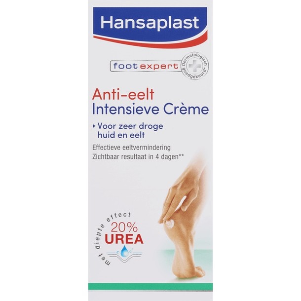 Hansaplast Foot Expert Anti-Eelt Intensieve Crème bevat een innovatieve combinatie van een zeer effectieve, eelt verminderende concentraat UREA (20%) en de Aquaporin technologie. De formule stimuleert de hydratatie van de huid en biedt een langdurig resultaat. In slechts vier dagen wordt de huid voelbaar zachter en soepel.