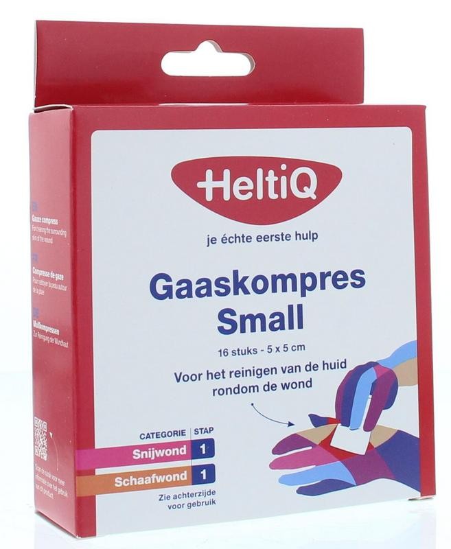 HeltiQ Gaaskompres is een steriel kompres voor het reinigen en afdekken van natte en droge wonden (natte wonden zijn wonden met veel wondvocht). Het kan samen met iedere (ontsmettende) vloeistof worden gebruikt. Het HeltiQ Gaaskompres heeft een fijne structuur en is gemaakt van 100% katoen. Hierdoor kan het een grote hoeveelheid wondvocht opnemen. Bovendien is het kompres comfortabel en zacht. Het rafelt niet en blijft goed in model. Het kompres is steriel en biedt een eerste bescherming tegen vuil, vocht en bacteriën.