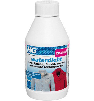 HG waterdicht voor textiel is speciaal ontwikkeld om wol, katoen, linnen en alle hiermee gemengde weefsels water- en vuilafstotend te maken. HG waterdicht voor textiel is onder andere te gebruiken om kinderkleding, regenkleding, skikleding, spijkergoed, meubelhoezen, tuinmeubelhoezen, tafellakens en dergelijke water-, en vuilafstotend te maken. De te behandelen kleding dient altijd schoon en droog te zijn. Voor de handwasmethode wordt 6 liter water in een emmer gedaan waaraan 1 flacon HG waterdicht voor textiel moet worden toegevoegd.