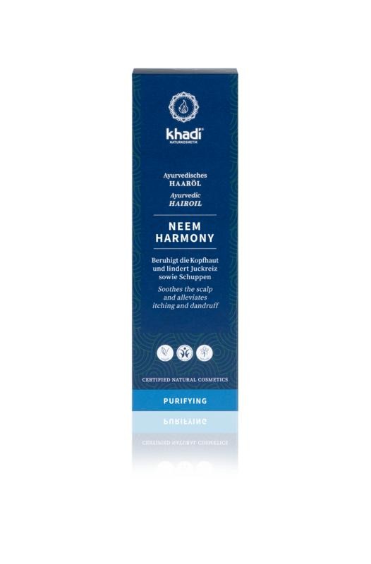 De Khadi Neem Harmony haarolie brengt de hoofdhuid in balans en bevat bruine mosterdolie en neem die de hoofdhuid kalmeren, de productie van talg reguleren en roos tegengaan.