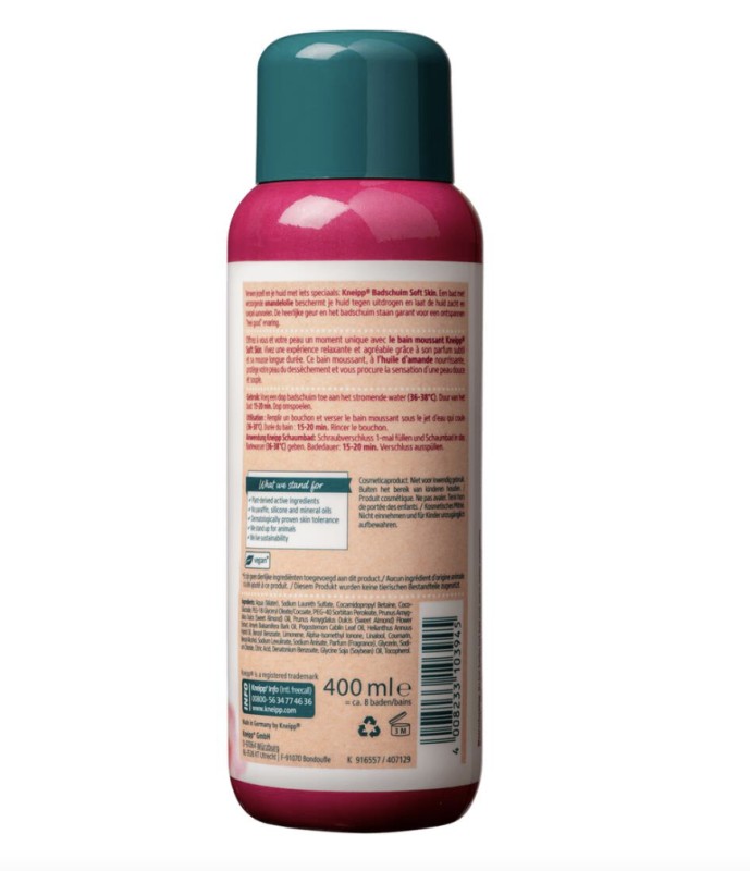 De verzorgende Kneipp badschuim amandelbloesem bevat waardevolle verzorgende amandel- en jojoba-olie voor een natuurlijke hydratatie en bescherming van de huid.