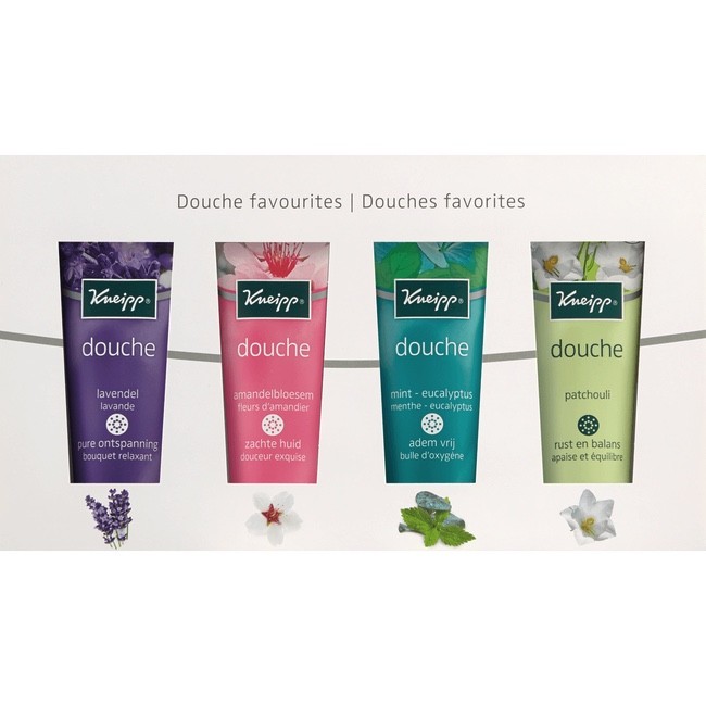 Ontspan onder een warme douche en verwen jezelf met de heerlijk geurende douches van Kneipp Douche Favorites Geschenkset. Deze luxe geschenkset bevat vier heerlijke Kneipp verwendouches: douche amandelbloesem 75 ml, douche lavendel 75 ml, douche mint-eucalyptus 75 ml, douche passievrucht-grapefruit 75 ml. Kneipp. Elk Kneipp product heeft een eigen specifieke werking en geur en is pure verwennerij voor lichaam en geest. Alle producten van Kneipp zijn dermatologisch getest en vrij van minerale oliën en conserveringsmiddelen, mild voor alle huidtypen en niet op dieren getest.