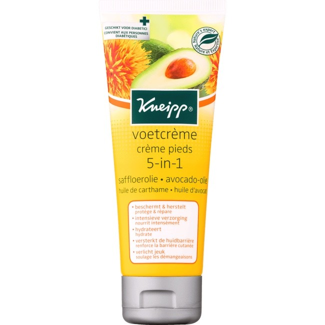 Kneipp Voet Crème 5-in-1 is een effectieve alles in één verzorging voor de voeten. De voetencrème bevat een speciale combinatie van huid gerelateerde plantaardige oliën, rijk aan verzadigde en onverzadigde vetzuren. Saffloerolie verzorgt intensief, maakt de huid soepel en verbetert de huidstructuur. Avocado-olie hydrateert intensief en ondersteunt de regeneratie van de huid. Wetenschappelijke studies tonen het unieke 5-in-1 effect van deze crème aan.