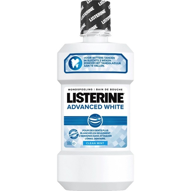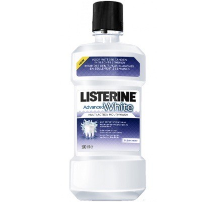 Listerine Advanced White Clean Mint Multi Action Mouthwash is ontwikkeld om je tanden witter te maken en tandverkleuring tegen te gaan. De vernieuwde mondspoeling bevat een unieke Multi Effect Formule, essentiële oliën en fluoride. Je krijgt een frisse adem en werkt tegelijkertijd als een whitening voor je tanden.