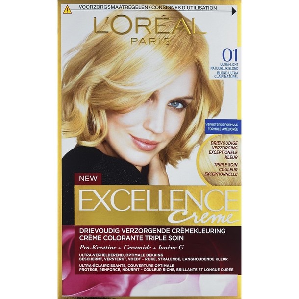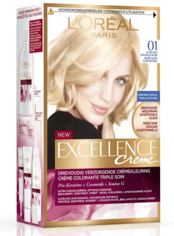 L'Oréal Paris Excellence Crème Verzorgende Crèmekleuring 01 Ultra Licht Natuurlijk Blond is een permanente haarkleuring die zorgt voor een natuurlijke kleur met mooie nuances die tot wel 6 weken levendig en glanzend blijft. De unieke drievoudige formule beschermt het haar voor, tijdens en na het kleuren. Vooraf worden de kwetsbare delen van het haar beschermd door het serum. Tijdens het kleuren zorgt de kleurcrème met keratine-AA voor bescherming en na het kleuren geeft de verzorging extra zachtheid en bescherming. Een rijke, levendige haarkleur met een zijdezachte finish als resultaat!