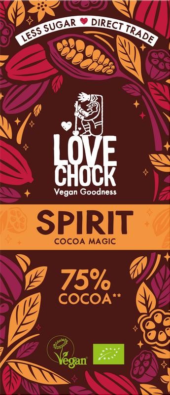 Ontdek de betoverende magie van cacao met Spirit, onze rijke pure chocolade. Gemaakt met de beste natuurlijke ingrediënten en van nature laag in suiker. Lovechock Spirit is niet alleen 100% vegan en biologisch, maar wordt ook verpakt in thuis composteerbare folie. Geniet zorgeloos van de magie van cacao!