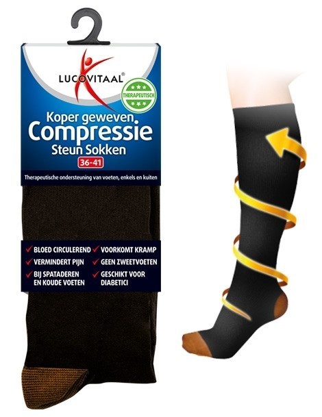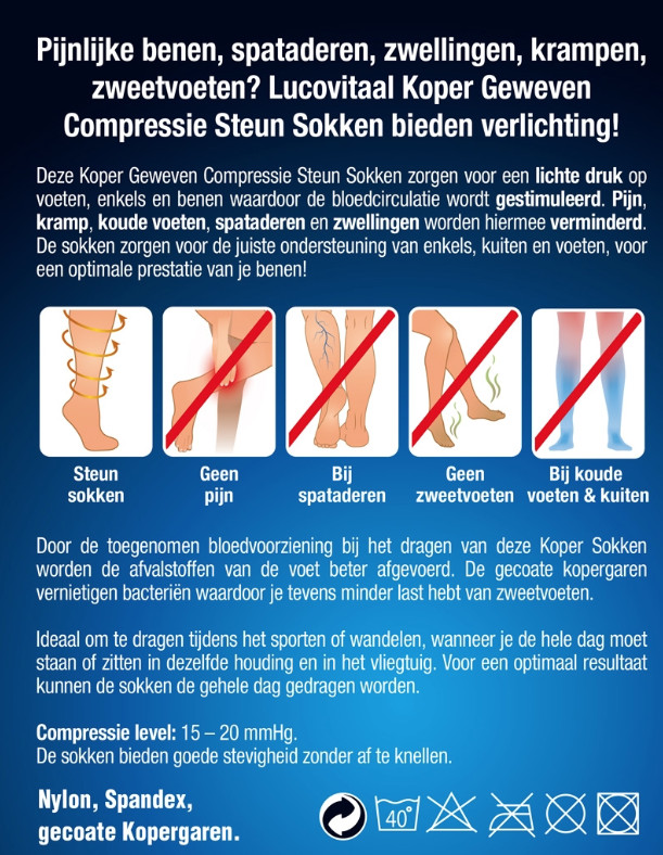 Pijnlijke benen, spataderen, zwellingen, krampen, zweetvoeten? Lucovitaal Koper Geweven Compressie Steun Sokken bieden verlichting!