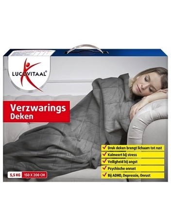 De Lucovitaal Verzwaringsdeken helpt o.a. om hyperactieve personen te helpen ontspannen en te zorgen voor een betere nachtrust. De deken geeft geborgenheid, een veilig gevoel (bij angst) en kalmeert bij onrustigheid doordat het zich aanpast aan het lichaam. Ook geschikt bij ADHD, spasmen, ernstige gedragsproblemen en ontspanningsproblemen zoals bij Huntington en Korsakov. Maar ook bij pijn, depressie of dementie kan de Verzwaringsdeken gebruikt worden.