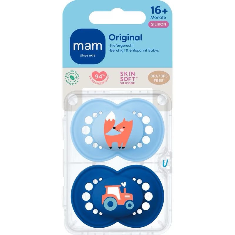 MAM fopspenen zijn ontwikkeld in samenwerking met tandartsen en hebben een orthodontische vorm voor een gezonde tand- en kaakontwikkeling. Dankzij het symmetrische speenschild ligt de speen altijd goed in de mond van de baby. De luchtgaten, het gebogen speenschild en de noppen aan de binnenkant van het schild zorgen dat de speen bijzonder zacht aanvoelt voor de gevoelige babyhuid. De speenknop is gemakkelijk vast te pakken door kleine babyhandjes. De MAM Original fopspeen is gemaakt van SkinSoft™ Silicone, waardoor de speen door 94% van de baby's wordt geaccepteerd.² De fopspenen worden geleverd in een praktisch sterilisatie- en transportdoosje, waarin ze snel en zonder extra apparatuur in de magnetron gesteriliseerd kunnen worden. Dit zorgt voor een besparing van 77% CO₂, energie en water.³ De MAM Original is de eerste klimaatneutrale MAM fopspeen. Het schild en de knop zijn gemaakt van duurzaam, bio-circulair materiaal om de CO₂-voetafdruk zo klein mogelijk te houden. De resterende CO₂ wordt door MAM gecompenseerd in samenwerking met Climate Partner.¹ De MAM Original fopspeen voldoet aan de EN1400 norm en is BPA- en BPS-vrij.