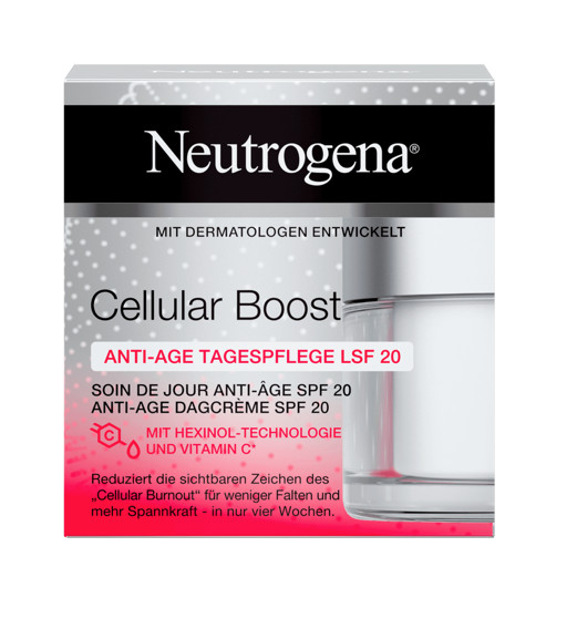 Cellular Boost Anti-Age Dagcrème SPF20 vermindert de uiterlijke tekenen van "Cellular Burnout" voor zichtbaar zachtere rimpels en meer elasticiteit in slechts 4 weken*. Met zonbeschermingsfactor 20 om de huid te beschermen tegen UV-stralen. "Cellulaire Burnout" is een van de belangrijkste oorzaken van huidveroudering. Het wordt veroorzaakt door UV-straling en milieuvervuiling. Stress en uitputting versnellen het proces. Cellulaire Burnout vermindert de functie van de huidcellen, wat leidt tot de drie belangrijkste tekenen van veroudering: rimpels, verlies van elasticiteit en een ongelijkmatige teint. Cellular Boost vermindert deze tekenen van "Cellulaire Burnout". Rimpels nemen zichtbaar af, de teint en de elasticiteit van de huid worden merkbaar beter, uw huid krijgt nieuwe energie.