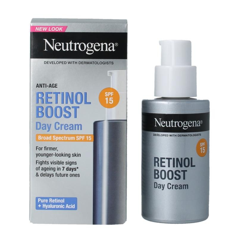 Ontdek Neutrogena® Retinol Boost Dagcrème SPF 15, een lichte en krachtige dagcrème ontwikkeld met dermatologen om zichtbare tekenen van huidveroudering al vanaf 7 dagen* doeltreffend aan te pakken. Dankzij de formule verrijkt met pure retinol, hyaluronzuur en mirtenbladextract werkt deze verzorging op rimpels, stevigheid, elasticiteit, pigmentvlekken en huidtextuur. Verrijkt met SPF15, breed spectrum UVA/UVB, beschermt deze crème je huid ook tegen zonneschade - een van de belangrijkste oorzaken van huidveroudering. Breng een SPF50 aan voor je de deur uitgaat om optimaal beschermd te zijn tegen de zon. Wetenschappelijk getest: deze verzorging toont al na 1 week een zichtbare verbetering van de huidtextuur en na 8 weken een significante vermindering van rimpels en pigmentvlekken. De lichte textuur is ideaal onder make-up en geschikt voor dagelijks gebruik. *Klinische studie bij 38 vrijwilligers, resultaten bij dagelijks gebruik.