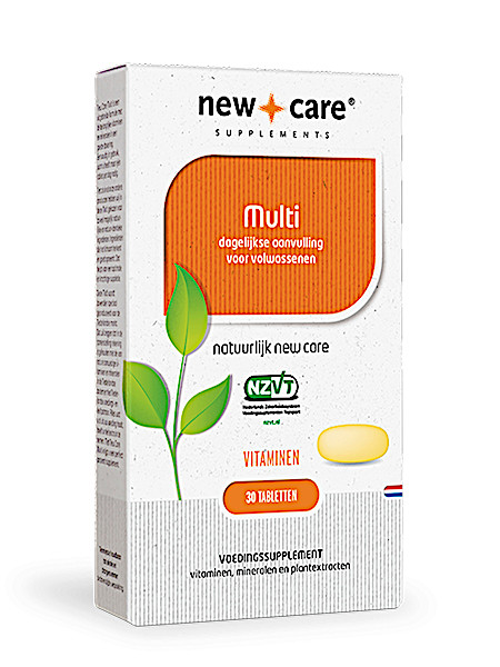 Deze Multi wordt bovendien speciaal geproduceerd voor de Nederlandse markt. Dat wil zeggen dat in de samenstelling rekening is gehouden met de van nature aanwezige vitaminen en mineralen in de Nederlandse bodem en het Nederlandse voedings- en leefpatroon. Alles wat u al uit uw voeding haalt, hoeft u niet extra in te nemen. Met New Care Multi krijgt u een perfect passend supplement.