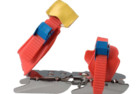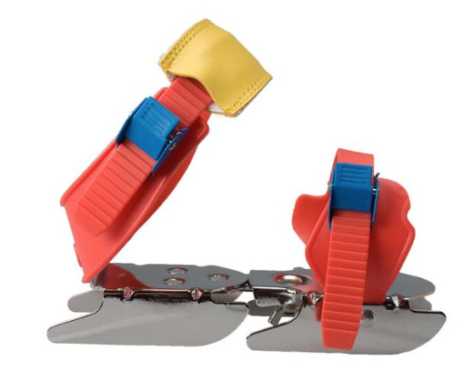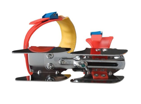 Glij-ijzers om onder je schoenen te binden met verchroomde ijzers en handige snelsluitingen. In te stellen voor de maten 24 t/m 34