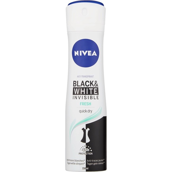 NIVEA Black & White Anti-Transpirant Spray 150 ml voorkomt zowel witte strepen op donkere kleding als gele vlekken in lichte kleding. De spray geeft 48 uur lang betrouwbare bescherming tegen transpiratie en lichaamsgeur en biedt de milde verzorging van NIVEA.