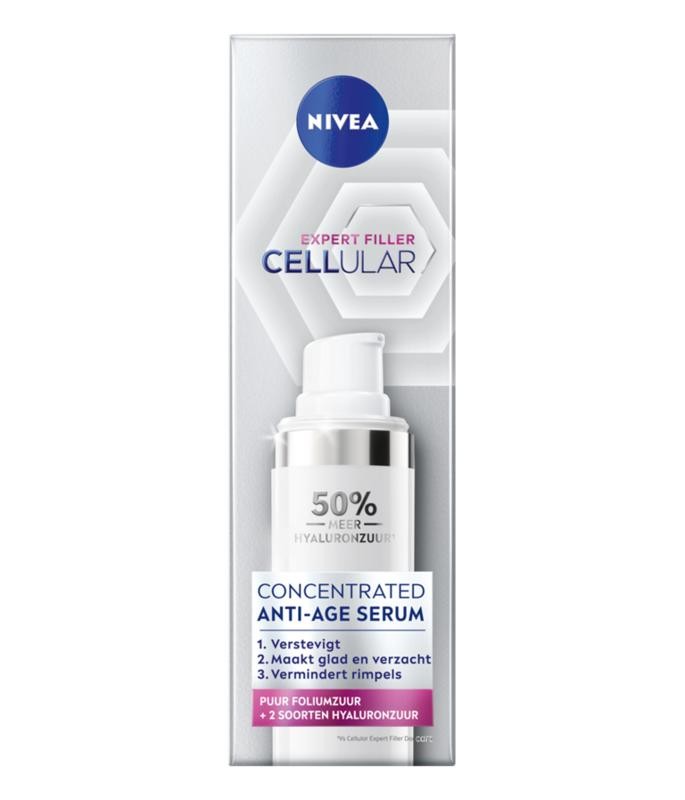 Nivea Cellular Expert Filler Anti-Age Serum met Puur Foliumzuur en 50% meer Hyaluronzuur voor een opvullend effect vanaf 24 uur.