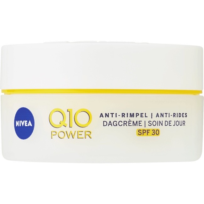 NIVEA Q10 POWER Anti-Rimpel Dagcrème SPF30 combineert het cel-actieve Q10 met 10X meer Creatine vergeleken met voorgaande formules. Het bestrijdt effectief fijne lijntjes en rimpels en zorgt voor een voelbaar stevigere huid. SPF 30 en UVA/UVB bescherming helpen het ontstaan van nieuwe rimpels door invloeden van buitenaf te voorkomen. De verzorgende formule zorgt bovendien voor intensieve hydratatie.