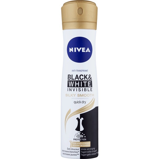 NIVEA Invisible For Black & White Silky Smooth Anti-Transpirant is ontwikkeld voor een zijdezachte huid, irriteert de huid niet na het scheren én voorkomt zowel witte strepen op donkere kleding als ook gele vlekken in lichte kleding. 48 uur lang betrouwbare bescherming tegen transpiratie en lichaamsgeur en biedt de milde verzorging van NIVEA.