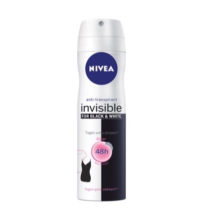 Nivea Invisible For Black & White Clear Anti-Transpirant is de eerste deodorant die zowel witte strepen op donkere kleding als ook gele vlekken in lichte kleding voorkomt. Geeft 48 uur lang betrouwbare bescherming tegen transpiratie en lichaamsgeur en biedt de milde verzorging van Nivea.