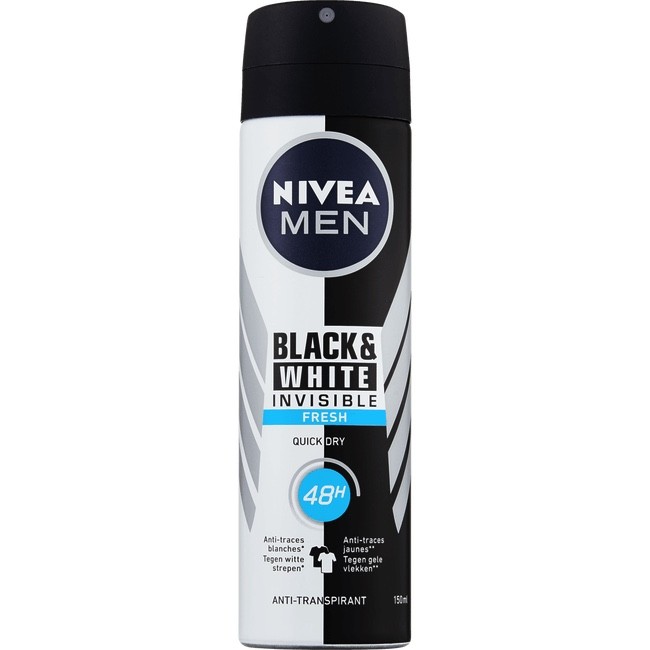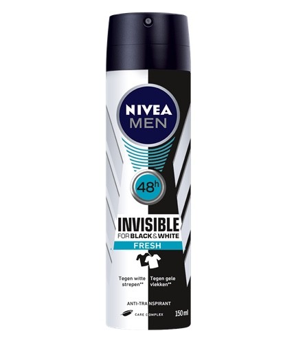 NIVEA MEN Invisible for Black & White Fresh Anti-Transpirant, de eerste deodorant die effectief 48 uur tegen transpiratie beschermt én jouw kleding beschermt tegen witte strepen op zwarte kleding en gele vlekken in witte kleding. Dus: zwart blijft zwart en wit blijft langer wit, zodat je favoriete kleding er langer goed uit blijft zien. Met een extra frisse sensatie & NIVEA® Men Care Complex. Nu kom jij zelfverzekerd de hele dag door met betrouwbare bescherming!