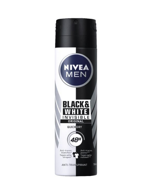 NIVEA MEN Invisible for Black & White Original Anti-Transpirant, de eerste anti-transpirant die effectief 48 uur tegen transpiratie beschermt én jouw kleding beschermt tegen witte strepen op zwarte kleding en gele vlekken in witte kleding. Dus: zwart blijft zwart en wit blijft langer wit, zodat je favoriete kleding er langer goed uit blijft zien. Nu kom jij zelfverzekerd de hele dag door met betrouwbare bescherming!