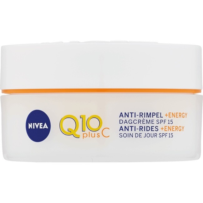 Speciaal voor de vermoeide huid is er de NIVEA Q10 Plus Energy+ Energy Dagcrème SPF15. Deze dagcrème bevat twee uiterst effectieve antioxidanten en werken samen met de natuurlijke eigenschappen van de huid. Q10 is een krachtig actief ingrediënt dat de huid van nature voorkomt in de huid. Met het ouder worden daalt de hoeveelheid Q10 in de huid waardoor de huid minder energie heeft. De uiterst effectieve formule vult het huideigen Q10 weer aan. Vitamine C beschermt de huid tegen vrije radicalen, een belangrijk effect om huidveroudering te vertragen.